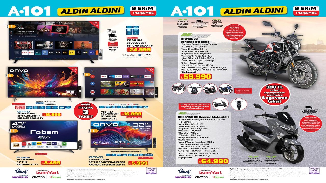 A101 aktüel 9 Ekim 2025 kataloğu yayımlandı ve alışveriş severlerin merakla beklediği indirimli ürünler belli oldu. Her hafta sunduğu avantajlı fırsatlarla dikkat çeken A101, bu haftaki kampanyasında da elektronik, beyaz eşya, bebek bakım ürünleri ve mutfak eşyalarıyla öne çıkıyor. A101 indirimleri kapsamında televizyon modelleri, küçük ev aletleri, temizlik malzemeleri ve kahvaltılık ürünler uygun fiyatlarla raflardaki yerini aldı. Ayrıca çikolata, atıştırmalık, dondurulmuş gıdalar ve günlük ihtiyaçlar için hazırlanan geniş ürün yelpazesi de tüketicilere cazip seçenekler sunuyor.