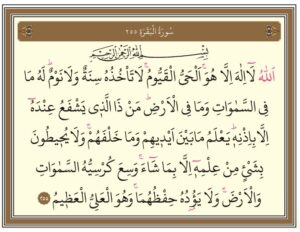 ﴿اَللّٰهُ لَٓا اِلٰهَ اِلَّا هُوَۚ اَلْحَيُّ الْقَيُّومُۚ لَا تَأْخُذُهُ سِنَةٌ وَلَا نَوْمٌۜ لَهُ مَا فِي السَّمٰوَاتِ وَمَا فِي الْاَرْضِۜ مَنْ ذَا الَّذ۪ي يَشْفَعُ عِنْدَهُٓ اِلَّا بِاِذْنِه۪ۜ يَعْلَمُ مَا بَيْنَ اَيْد۪يهِمْ وَمَا خَلْفَهُمْۚ وَلَا يُح۪يطُونَ بِشَيْءٍ مِنْ عِلْمِه۪ٓ اِلَّا بِمَا شَٓاءَۚ وَسِعَ كُرْسِيُّهُ السَّمٰوَاتِ وَالْاَرْضَۚ وَلَا يَؤُ۫دُهُ حِفْظُهُمَاۚ وَهُوَ الْعَلِيُّ الْعَظ۪يمُ ﴾ [البقرة: 255]