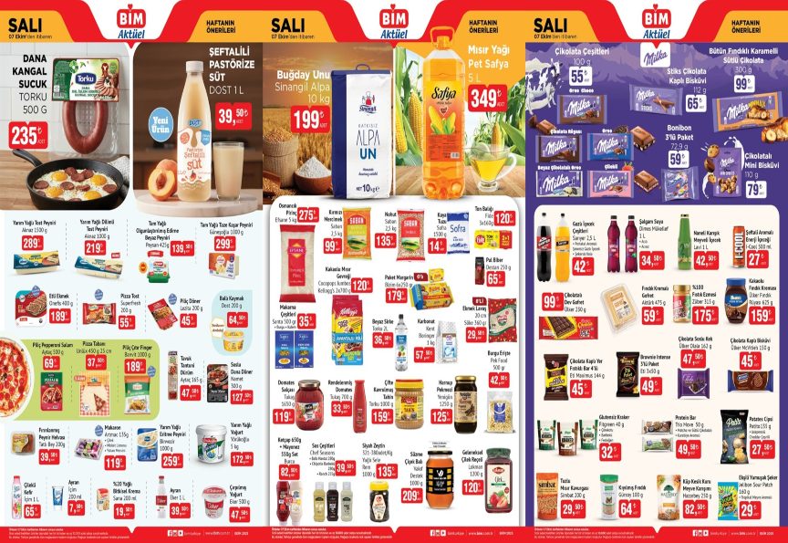 BİM 7 Ekim 2025 aktüel ürünler kataloğu tüketicilerin merakla beklediği indirimli fırsatlarla dolu olarak raflardaki yerini aldı. Her hafta olduğu gibi bu katalogda da temel gıda ürünlerinden şarküteri çeşitlerine, süt ürünlerinden atıştırmalıklara kadar birçok ürün cazip fiyatlarla satışa sunuluyor. Özellikle Torku Dana Kangal Sucuk, Aknaz Tost Peyniri, Safya Mısır Yağı, Efsane Osmancık Pirinç, Milka çikolata çeşitleri ve daha pek çok ürün uygun fiyatlarıyla dikkat çekiyor. Bu indirimler sayesinde hem ev ekonomisine katkı sağlamak hem de kaliteli ürünleri avantajlı şekilde satın almak mümkün oluyor.